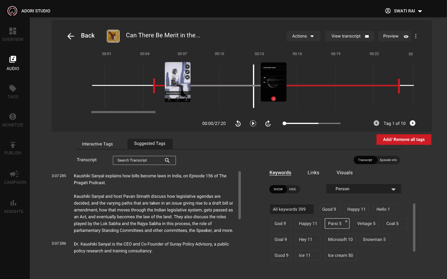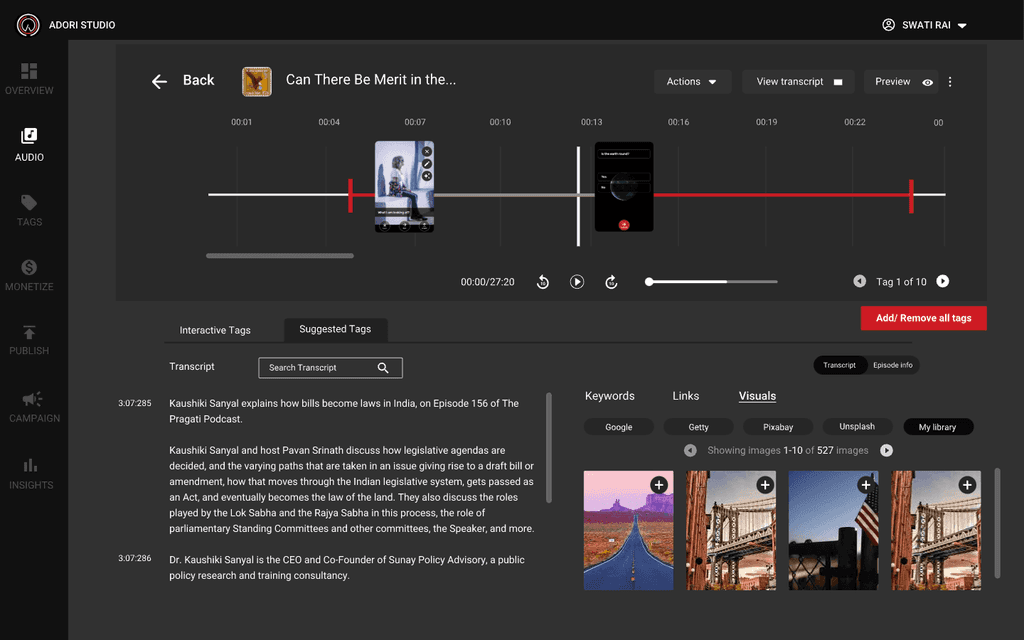 Once you have uploaded the audio, it will transcribe the audio and suggest you tags which you can put on the timeline and make it intractive.