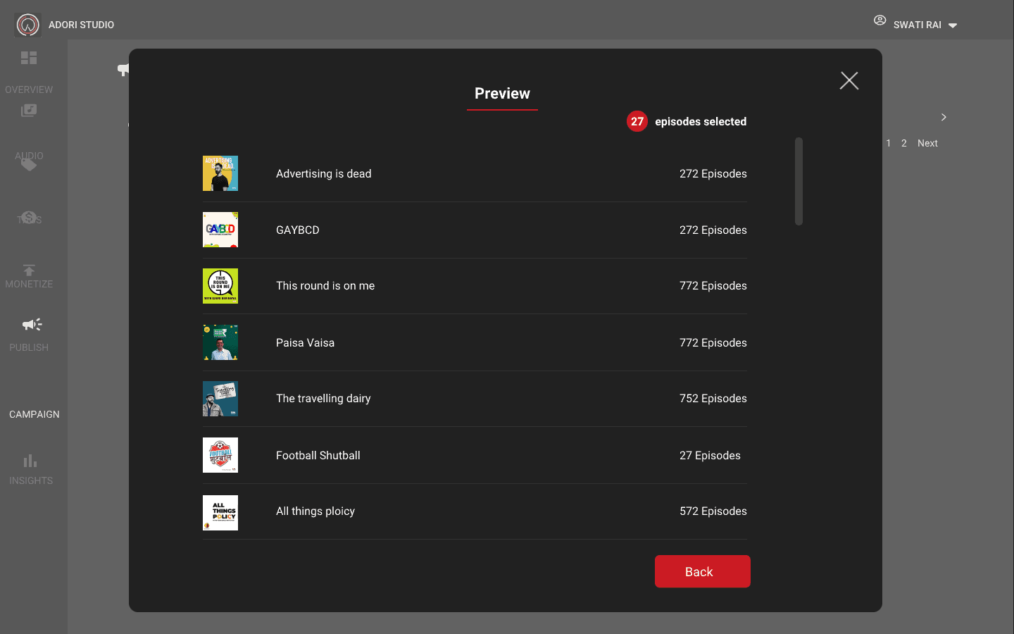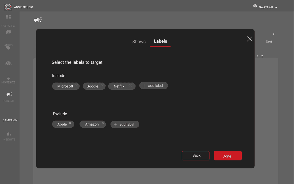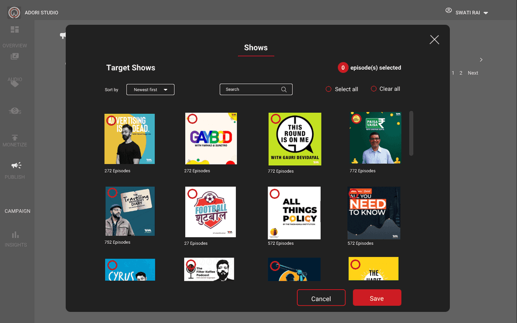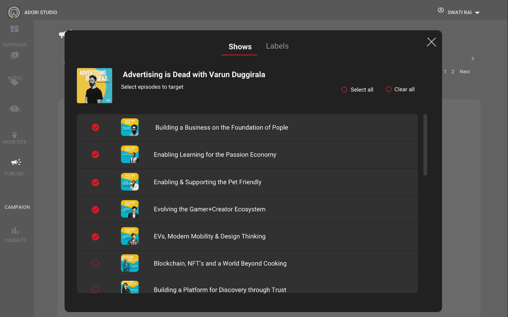 You will have list of shows, you will have option to filter it out and also have ability to select all the shows. Each shows will have so many episodes, you can select the episodes which you want to target.