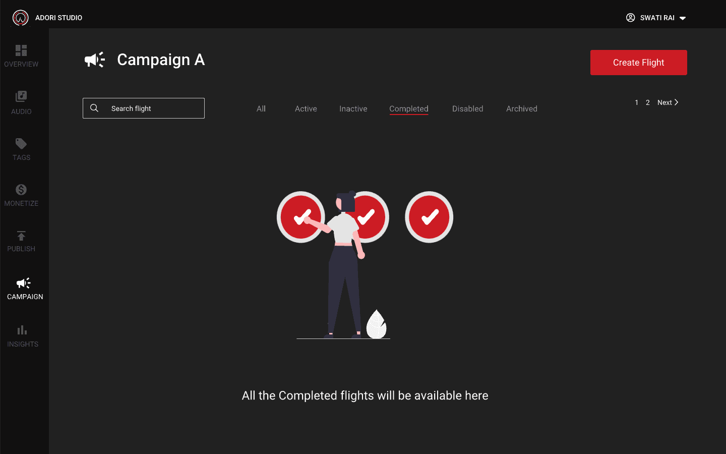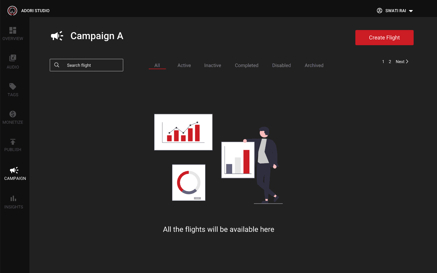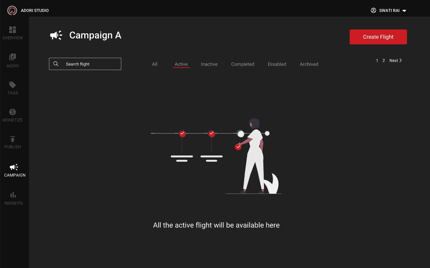 If you don't have any campaign, you will get a empty screen directing you to create an campaign. You can't create a flight unless you have an active campaign. On the home page if campaign you can also see how many active, inactive and completed campaign you have.