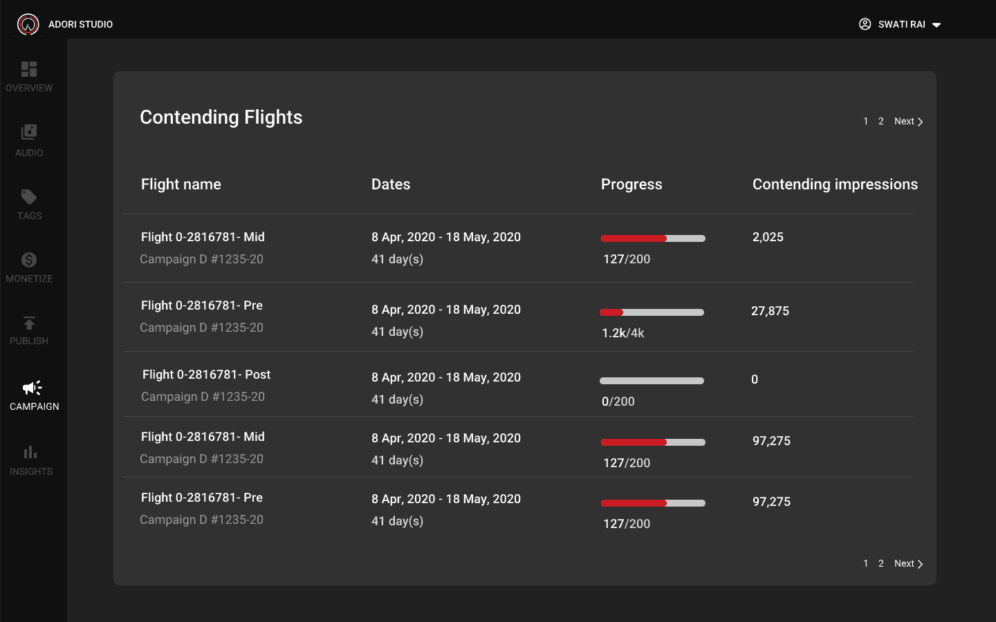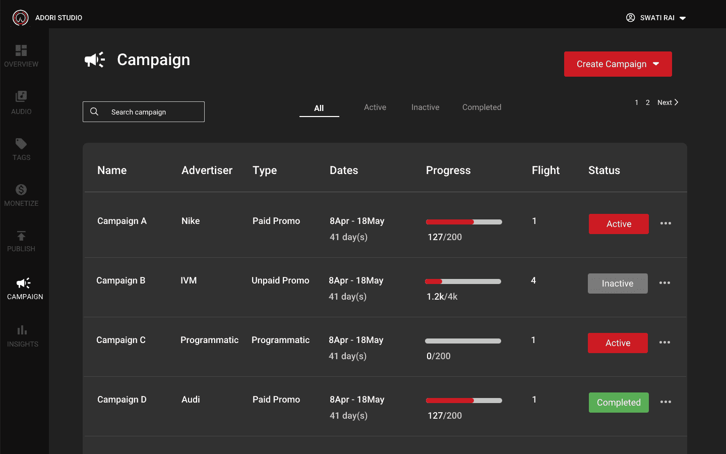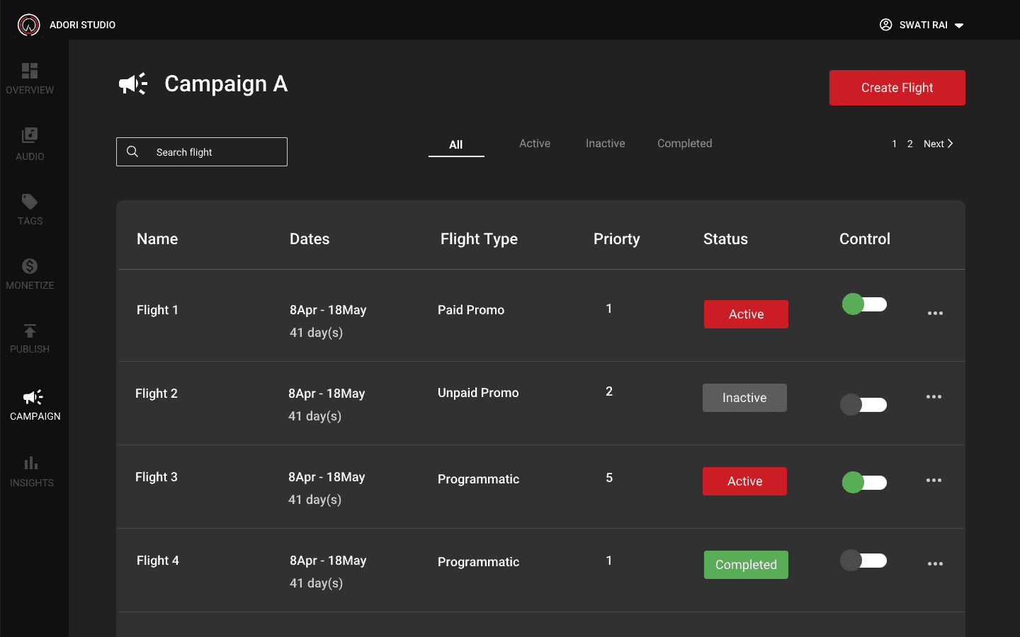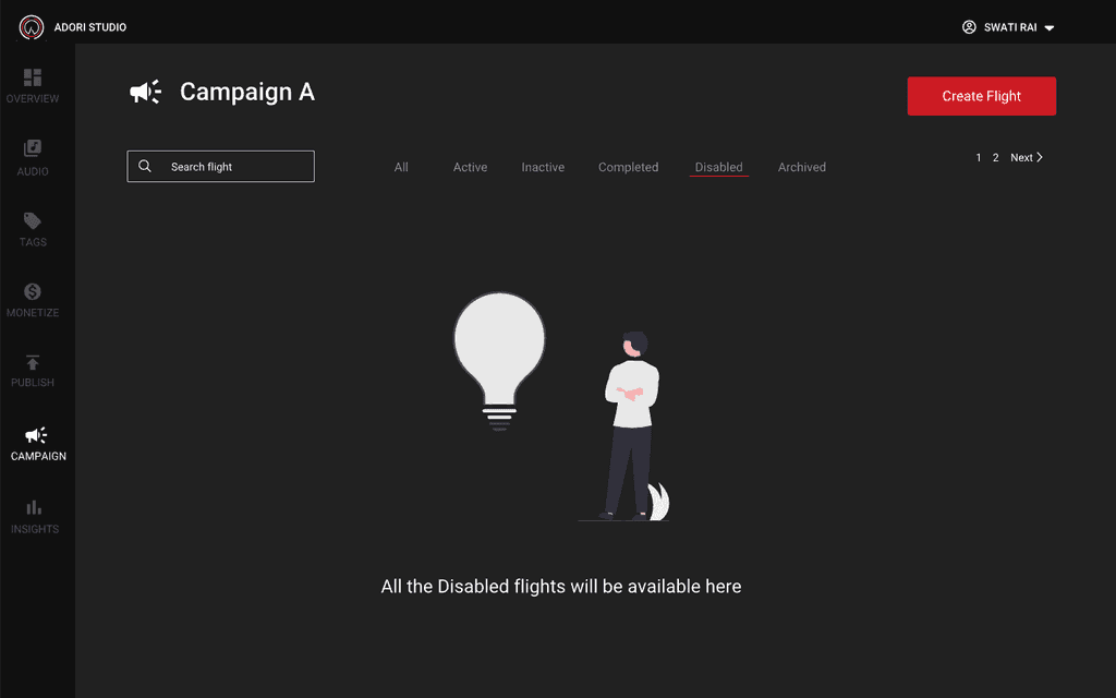 If you don't have any campaign, you will get a empty screen directing you to create an campaign. You can't create a flight unless you have an active campaign. On the home page if campaign you can also see how many active, inactive and completed campaign you have.